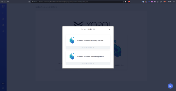 お持ちのバイロンウォレットの復元フレーズが15単語であれば、ヨロイを選択します。