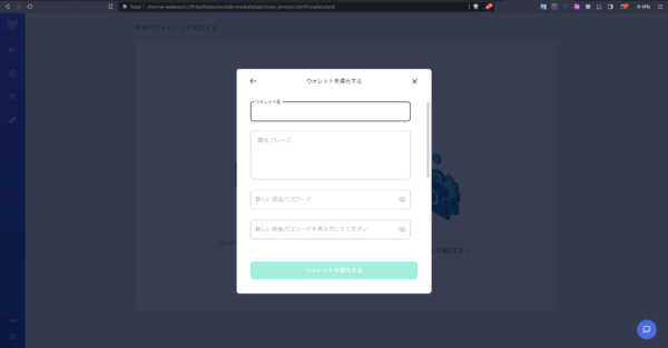 この画面になるので、先ほどメモした24語の復元フレーズを入力します。