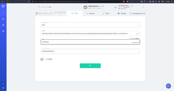 その後「送信」をクリックし、送金パスワードを入力しADAを送金すればテスト取引の完了です。