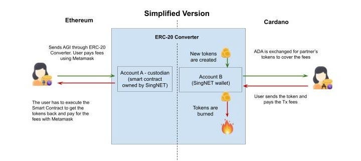 左上の緑矢印から解説します。まず、ERC20コンバーターを介してAGIを送ります。すると、AGIがスマートコントラクトでロックされ、同じ量の新しいトークンが作成されます。